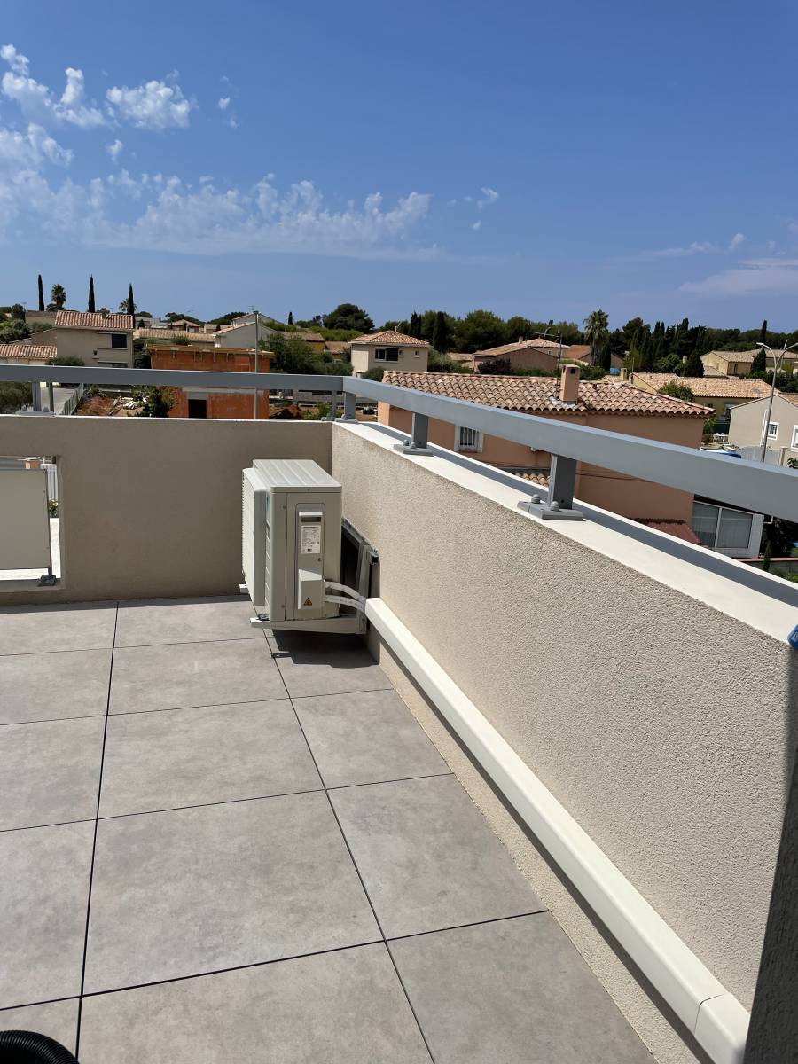 La liaison frigorifique descend le long de la baie vitrée puis longe le muret en partie basse car dans cette résidence les goulottes ne doivent pas être visible de l'extérieur.
