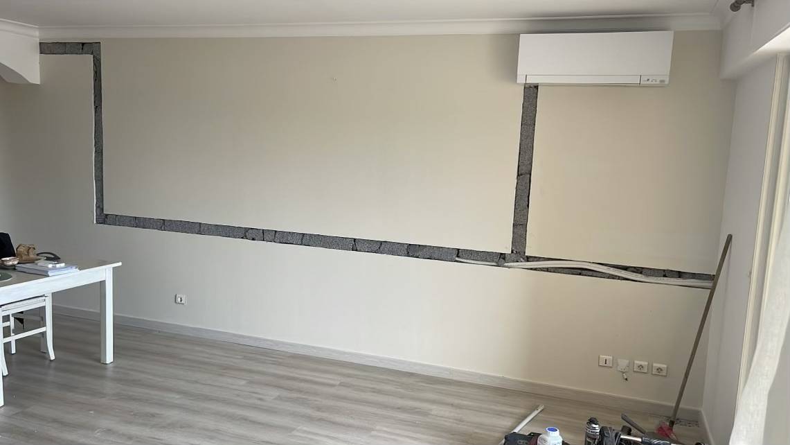 Les clients ne souhaitaient pas avoir des goulottes qui traverse l'appartement nous avons donc proposé de réaliser des saignées dans les murs fin de faire passer les liaisons frigorifiques dans les doublages.
