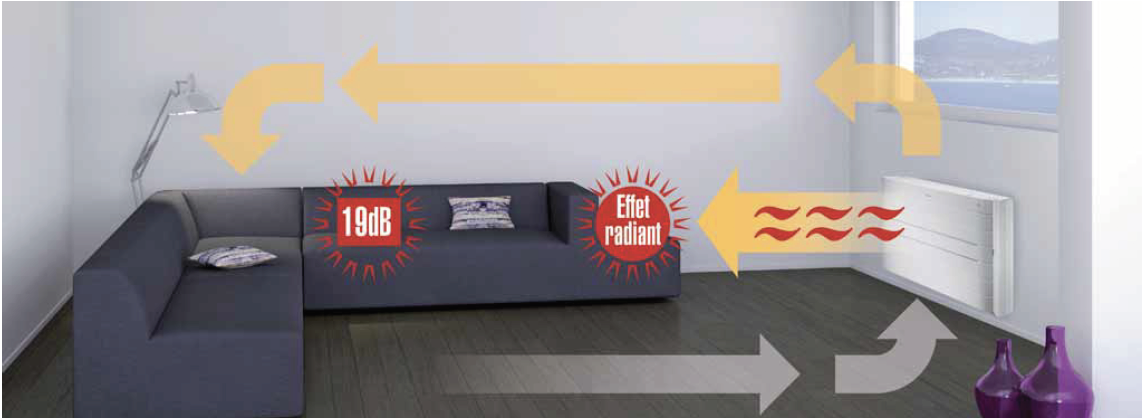 Un température homogène et uniformément répartie dans toute la pièce, en activant le mode radiant le panneau frontal diffuse une chaleur douce supplémentaire en complément de la soufflerie qui devient quasiment inaudible.