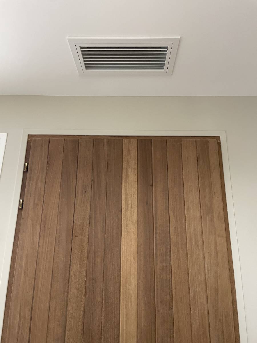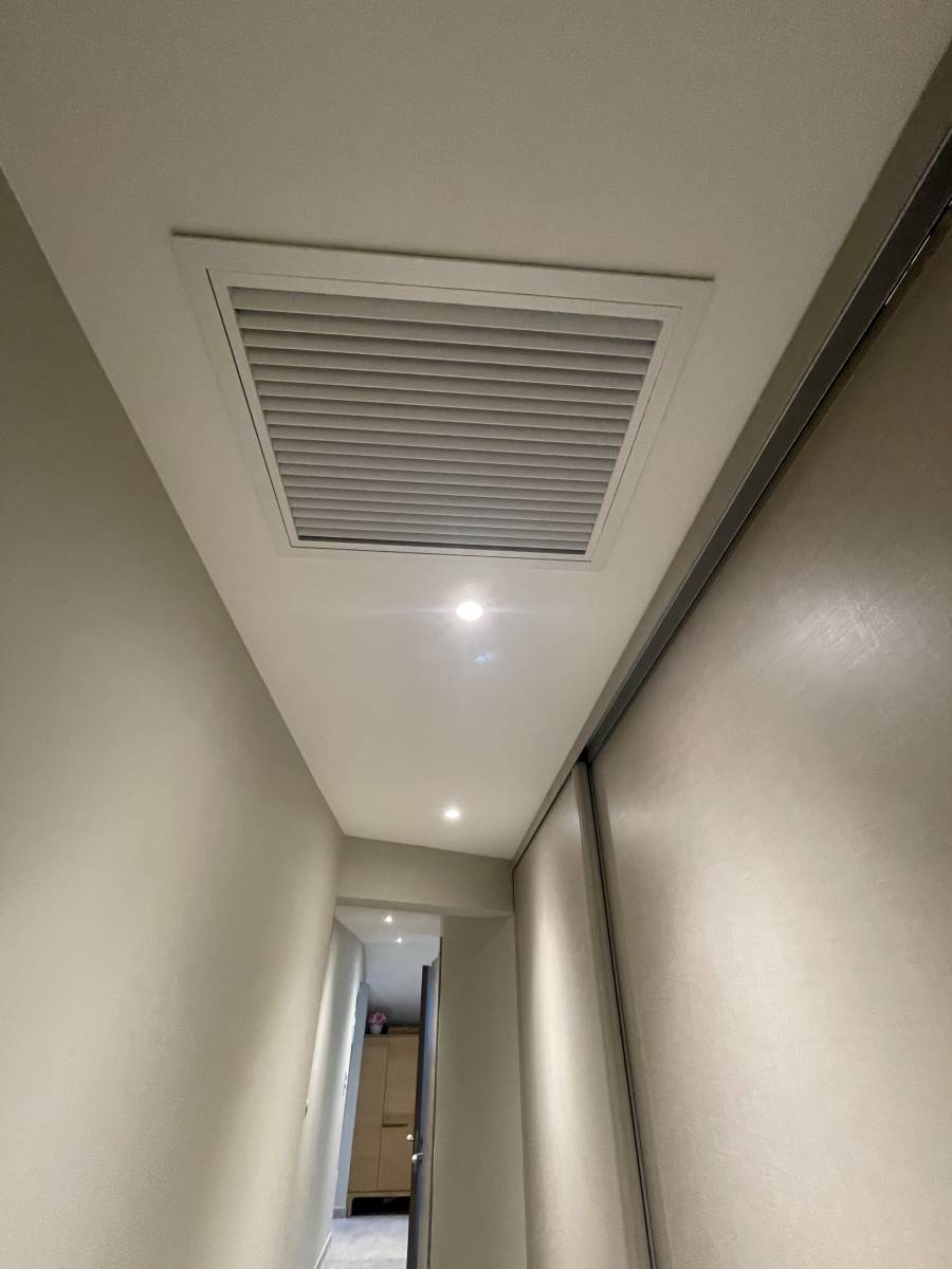 Le séjour est traité avec une unité intérieure gainable et 3 diffuseurs plafonniers installé au-dessus de la baie vitrée et d'une fenêtre.