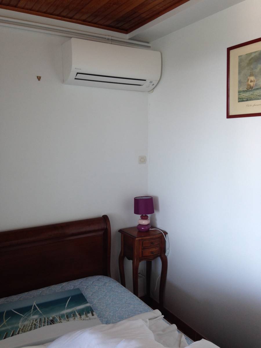 Une climatisation installée dans le salon, le groupe extérieur en dos à dos mais en partie basse de la façade, entre les fleurs pour ne le voir et une autre dans la chambre derrière la maison avec le groupe extérieur dans un angle et toujours en partie basse.