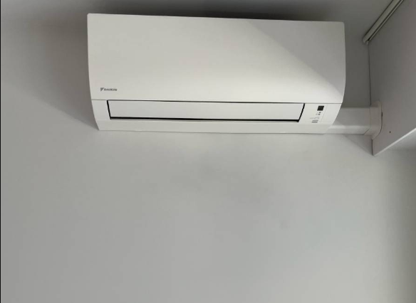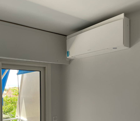 Dans ce petit immeuble de Sanary sur mer nous avons installé un bi-split Daikin, c'est à dire un seul groupe extérieur relié à une unité intérieure design de la gamme Emura 3 dans le séjour et à une autre unité intérieure de la gamme Confora dans la chambre.