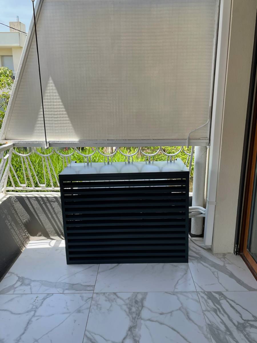 Les liaisons frigorifiques cheminent sous goulotte le long de la terrasse afin de préserver l'esthétique et la décoration de l'appartement, nous avons ajouté un cache pour le groupe extérieur dans la couleur des baies vitrée.