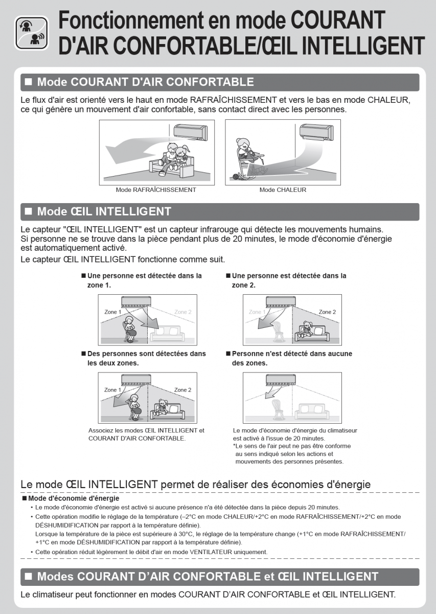 Mode économique : après 20 minutes d’absence dans la pièce, le climatiseur réversible laisse la température remonter de 2°C en mode rafraîchissement ou baisser de 2°C en mode chauffage.