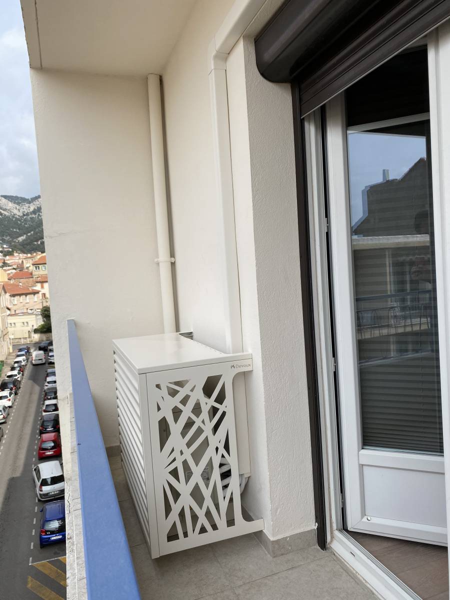 L'appartement traversant dispose de deux balcons ce qui a permis d'installer deux groupes de climatisation, un mono-split pour le séjour et un bi-split pour la chambre et le bureau.
