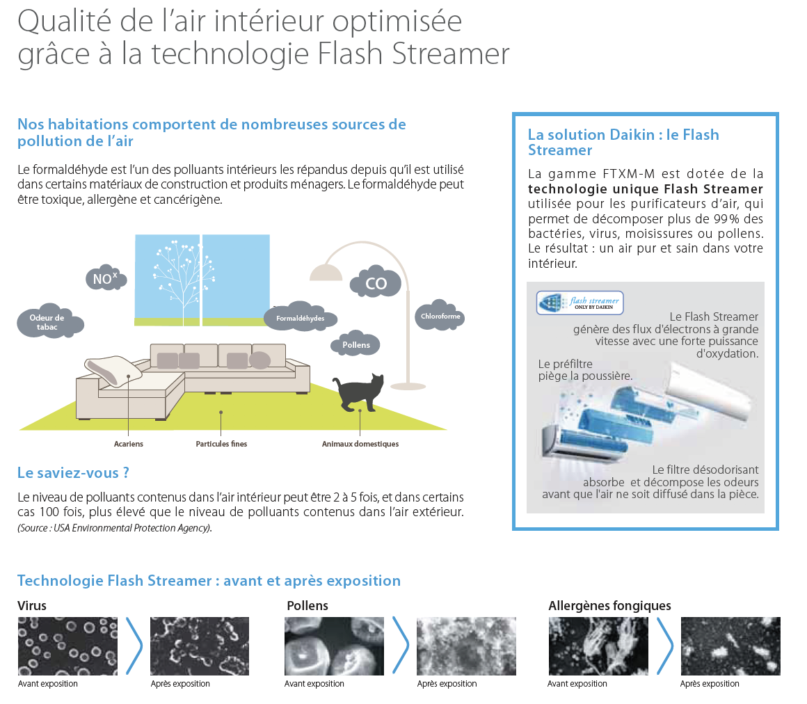 Flash Streamer qui permet de décomposer plus de 99% des bactéries, virus, moisissures ou pollens et des filtres anti-allergènes contre les bactéries allergènes tels que les pollens pour la gamme